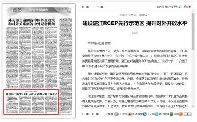 湛江毗邻东盟,是广东参与东盟区域合作的重要门户,在抢抓RCEP机遇方面具备得天独厚的优势。宁凌建议,以“地区典型示范、园区平台布局、产业特色打造和保障体系构建”为发展思路,建设湛江RCEP先行示范区,打造对外开放新高地。“建议以湛江已有的奋勇东盟产业园为基础,支持奋勇东盟产业园申报建设国家级RCEP经贸合作示范园区和国际合作产业园区,并在湛江示范区内培育一批具有区域资源禀赋、特色明显的产业集群,为湛江实现更高水平开放发展提供有力支撑。”